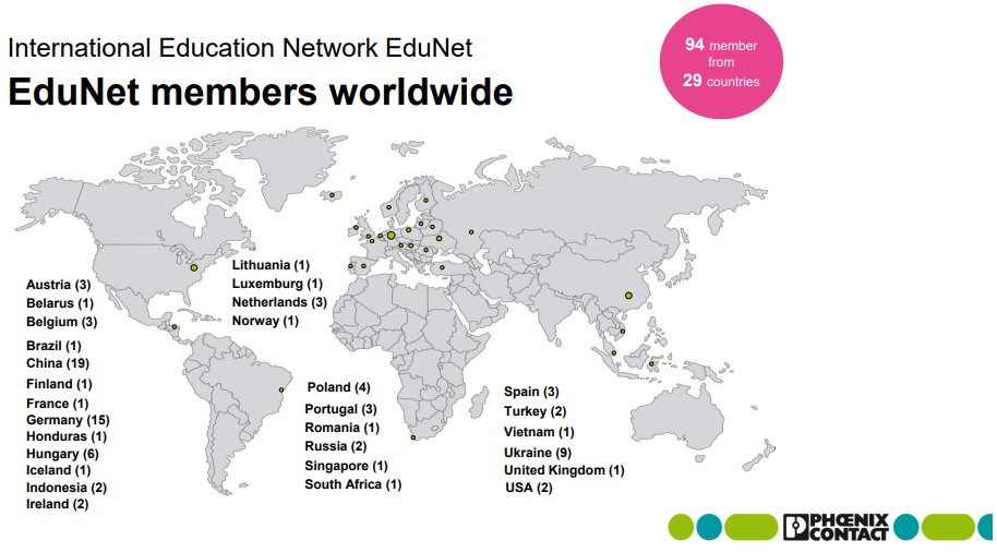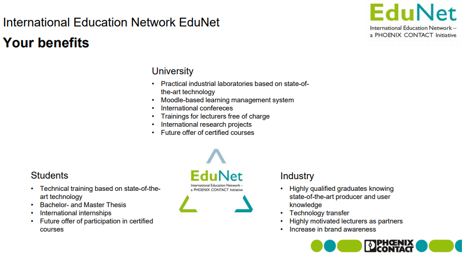 Firma Phoenix Contact poprzez międzynarodową sieć uczelni wyższych w ramach programu EduNet wspiera wymianę i współpracę między uczelniami i przemysłem w różnych obszarach elektrotechniki i automatyki. Sieć ta umożliwia zintegrowanie wiedzy użytkowników i producentów z branży techniki automatyzacji w programie nauczania. Stworzone wspólnie laboratoria pomagają studentom w rozpoczęciu kariery zawodowej.