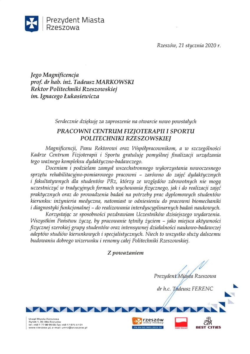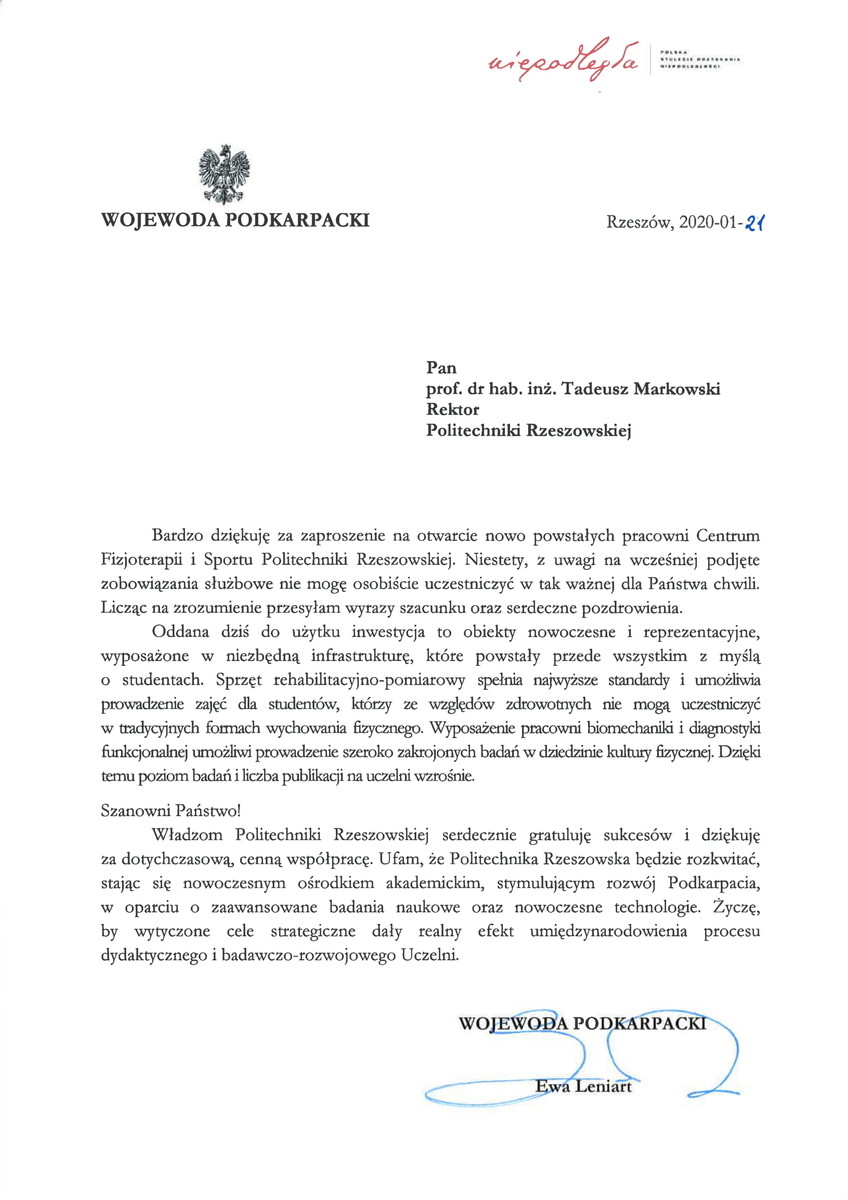 Otwarcia dokonał Rektor Politechniki Rzeszowskiej prof. dr hab. inż. Tadeusz Markowski. -Oddajemy dziś do użytku miejsce, które służyć będzie usprawnieniu ruchowemu studentów, którzy z uwagi na stan zdrowia nie są w stanie uczestniczyć w tradycyjnych formach wychowania fizycznego. Alternatywne formy zajęć WF-u są wprawdzie prowadzone w naszej Uczelni od ponad 30 lat, jednak Uczelnia się rozrasta - a co za tym idzie - z roku na rok przybywa studentów przebywających na długoterminowych zwolnieniach lekarskich oraz studentów z niepełnosprawnościami. Podyktowało to konieczność rozbudowy specjalistycznej pracowni dedykowanej tej grupie studentów - powiedział prof. Markowski.