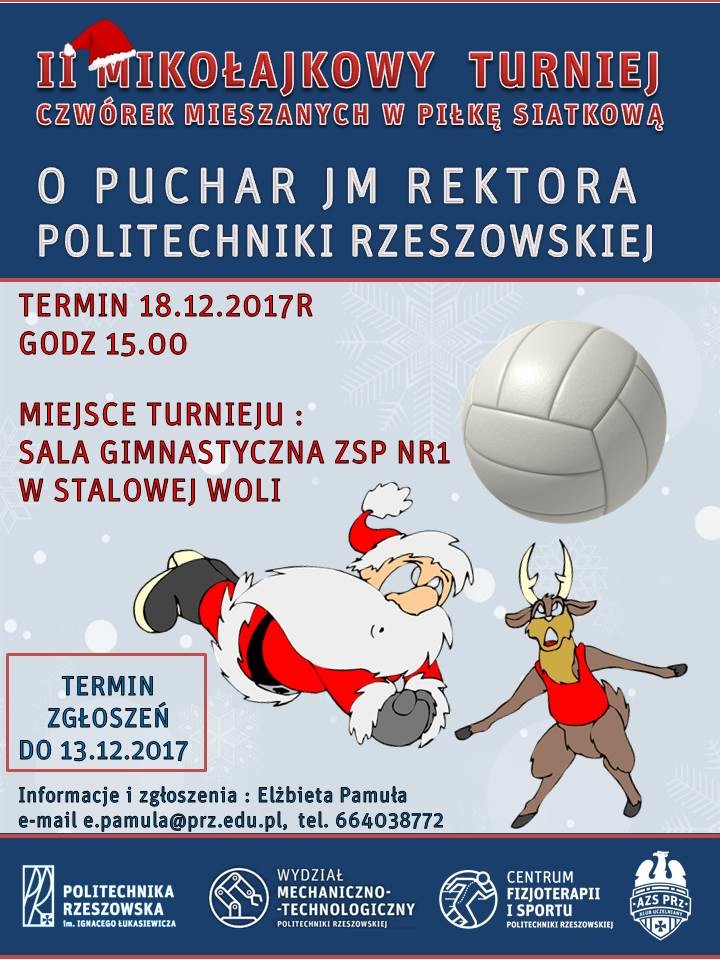 18 grudnia na Wydziale Mechaniczno-Technologicznym studenci zmierzą się w drugiej edycji turnieju mikołajkowego i zawalczą o puchar rektora Politechniki Rzeszowskiej. Zgłoszenia drużyn - czwórek mieszanych przyjmowane są do 13 grudnia  przez Elżbietę Pamułę pod adresem: e.pamula@prz.edu.pl oraz telefonicznie: 664 038 772.